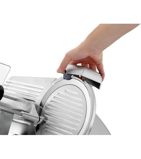 Die Ausstattung der optimierten Aufschnittmaschine mit einem 300er Messer uÌ?berzeugt durch technische Features in mehrfacher Hinsicht. Der leistungsstarke SchraÌ?gschneider verfuÌ?gt uÌ?ber einen Restehalter, einen MesserschaÌ?rfer, eine AufschnittfuÌ?hrung und um die Sicherheit zu gewaÌ?hrleisten einen zweifachen Messerschutz sowie einen Magnetschalter.