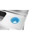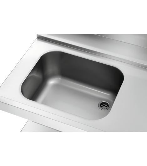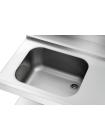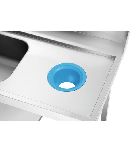 Die 1,2 m breite Vorabräumung mit Spüle und Abfallschacht ist ausgelegt für den rechtsseitigen Anbau an die Bartscher Durchschubspülmaschinen DS. Ein Grundboden bietet Abstellfläche für Spülkörbe.