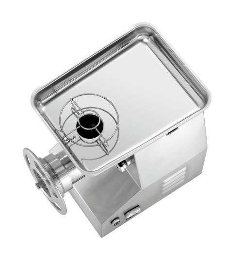 Der Fleischwolf mit Ungersystem, extra großem Einfüllschacht und belüftetem Motor schafft bis zu 500 kg pro Stunde. Die abnehmbare Zerkleinerungseinheit ermöglicht eine HACCP-konforme Zwischenlagerung im Kühlschrank.