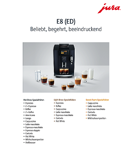 Um den vielseitigen Hochgenuss zu meistern, ist die E8 mit allen Standards von JURA vertraut und integriert zudem den Light Extraction Process. Sie brüht den Hot Brew klassisch für ein intensives Geschmackserlebnis und extrahiert den Light Brews bei rund 60 °C für den leichten Ready-to-Drink-Genuss. Ob Hot oder Light – beide Genusswelten profitieren von der Sweet-Foam-Funktion, die weitere Geschmackserlebnisse bereithält.