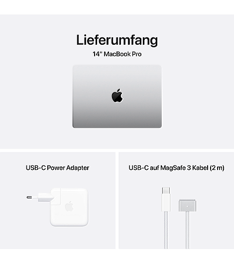 Drei Thunderbolt 5 Anschlüsse, HDMI Anschluss, SDXC Kartensteckplatz, MagSafe 3 Anschluss