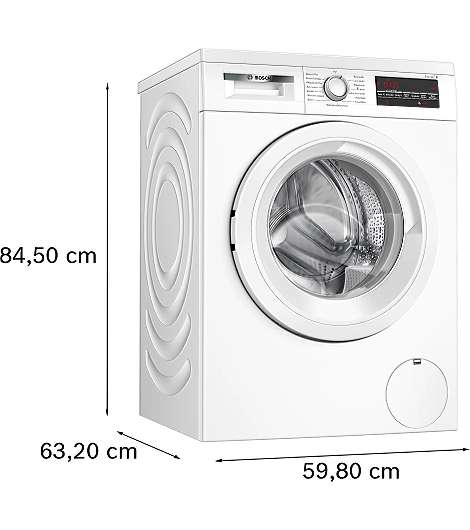 Bosch Serie 6 WUU28T22. Ladetyp: Frontlader. Nennkapazität: 9 kg, Schleuder-Klasse: B, Luftschallemission (Schleudern): 72 dB, Luftschallemmission (Waschen): 51 dB, Maximale Schleuderdrehzahl: 1400 RPM. Produktfarbe: Weiß. Breite: 598 mm, Tiefe: 599 mm, Höhe: 845 mm. Energieeffizienzklasse: A