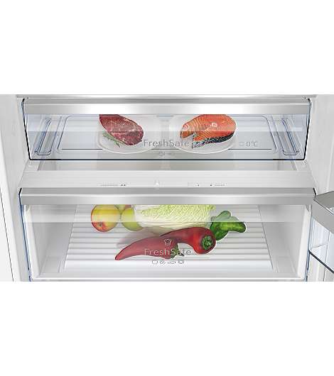 Neff N 50. Nutzinhalt Gesamteinheit: 383 l. Türscharnier: Links. Klimaklasse: SN-ST, Geräuschpegel: 34 dB. Nutzinhalt Kühlschrank: 285 l, Innenbeleuchtung Kühleinheit, Kühlschrank - Anzahl der Ablagen/Körbe: 4, Anzahl der Gemüseschubladen: 2. Nutzinhalt Gefrierfach: 98 l, Gefrierkapazität: 9,5 kg/24h, NoFrost-Funktion (Gefriereinheit). Fresh Zone Fach. Energieeffizienzklasse: E, Jährlicher Energieverbrauch: 256 kWh. Produktfarbe: Weiß