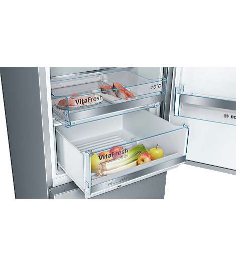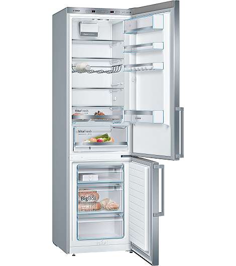 Bosch Serie 6 KGE398IBP. Nutzinhalt Gesamteinheit: 343 l. Türscharnier: Rechts. Klimaklasse: SN-T, Geräuschpegel: 38 dB. Nutzinhalt Kühlschrank: 249 l, Innenbeleuchtung Kühleinheit, Kühlschrank - Anzahl der Ablagen/Körbe: 5, Anzahl der Gemüseschubladen: 2. Nutzinhalt Gefrierfach: 94 l, Gefrierkapazität: 14 kg/24h. Fresh Zone Fach. Energieeffizienzklasse: B, Jährlicher Energieverbrauch: 119 kWh. Produktfarbe: Edelstahl