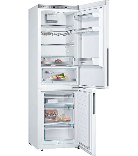 Bosch Serie 6 KGE36AWCA. Nutzinhalt Gesamteinheit: 308 l. Türscharnier: Rechts. Klimaklasse: SN-T, Geräuschpegel: 38 dB. Nutzinhalt Kühlschrank: 214 l, Innenbeleuchtung Kühleinheit, Kühlschrank - Anzahl der Ablagen/Körbe: 4, Anzahl der Gemüseschubladen: 2. Nutzinhalt Gefrierfach: 94 l, Gefrierkapazität: 14 kg/24h. Fresh Zone Fach. Energieeffizienzklasse: C, Jährlicher Energieverbrauch: 149 kWh. Produktfarbe: Weiß