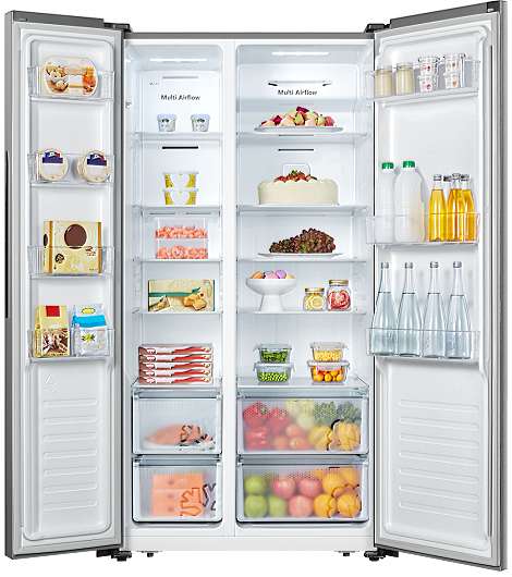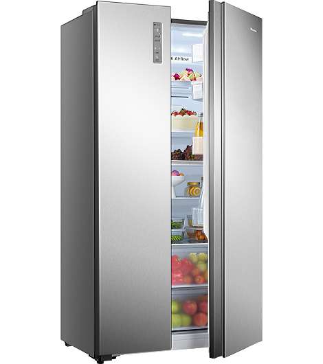 Hisense Side by Side - RS677N4ACC BK770. Geräteplatzierung: Freistehend, Produktdesign: Amerikanische Tür, Produktfarbe: Edelstahl. Nutzinhalt Gesamteinheit: 519 l, Klimaklasse: SN-T, Lärmemissionsklasse: B. Nutzinhalt Kühlschrank: 334 l, Lampentyp: LED. Nutzinhalt Gefrierfach: 185 l, Gefrierfachposition: Seitlich platziert, Gefrierkapazität: 8,5 kg/24h. Energieeffizienzklasse: C, Jährlicher Energieverbrauch: 198 kWh, Energieeffizienzskala: A bis G