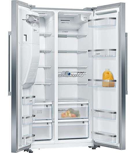 Bosch Serie 6 KAD93AIDP. Geräteplatzierung: Freistehend, Produktdesign: Amerikanische Tür, Produktfarbe: Edelstahl. Nutzinhalt Gesamteinheit: 562 l, Klimaklasse: SN-T, Lärmemissionsklasse: C. Nutzinhalt Kühlschrank: 371 l, Lampentyp: LED. Nutzinhalt Gefrierfach: 191 l, Gefrierfachposition: Seitlich platziert, Gefrierkapazität: 12 kg/24h. Kabellänge: 1,7 m
