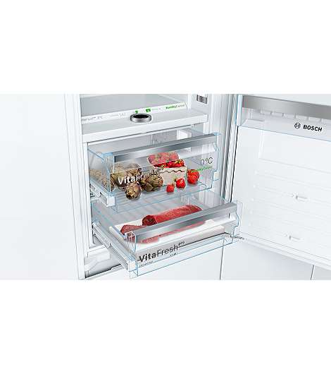 Bosch Serie 8 KIF86PFE0. Nutzinhalt Gesamteinheit: 223 l. Türscharnier: Rechts. Klimaklasse: SN-ST, Geräuschpegel: 36 dB. Nutzinhalt Kühlschrank: 156 l, NoFrost-Funktion (Kühleinheit), Innenbeleuchtung Kühleinheit, Kühlschrank - Anzahl der Ablagen/Körbe: 3. Nutzinhalt Gefrierfach: 67 l, Gefrierkapazität: 13 kg/24h, NoFrost-Funktion (Gefriereinheit). Fresh Zone Fach. Energieeffizienzklasse: E, Jährlicher Energieverbrauch: 252 kWh. Produktfarbe: Weiß