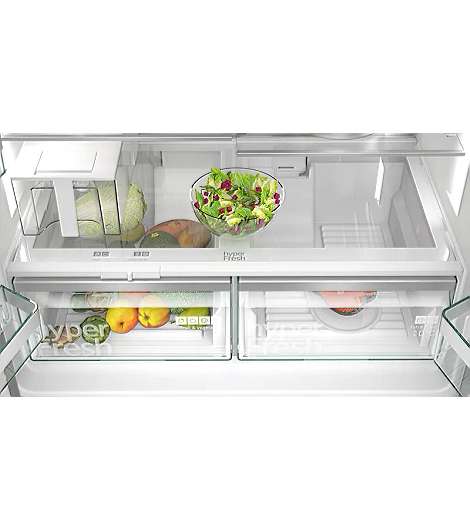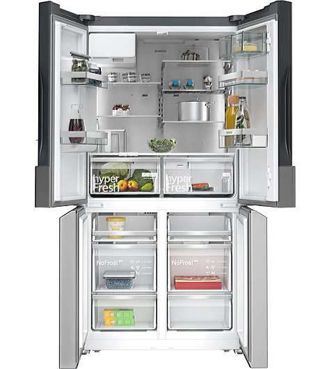 Siemens iQ500 KF96IAPEA. Nutzinhalt Gesamteinheit: 574 l, Klimaklasse: SN-T, Geräuschpegel: 39 dB. Nutzinhalt Kühlschrank: 375 l, NoFrost-Funktion (Kühleinheit), Multi Airflow System (Kühlschrank), Innenbeleuchtung Kühleinheit, Kühlschrank - Anzahl der Ablagen/Körbe: 5. Nutzinhalt Gefrierfach: 199 l, Gefrierkapazität: 16 kg/24h, NoFrost-Funktion (Gefriereinheit). Fresh Zone Fach. Energieeffizienzklasse: E, Jährlicher Energieverbrauch: 327 kWh. Produktfarbe: Gebürsteter Stahl