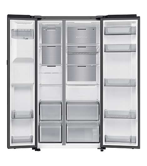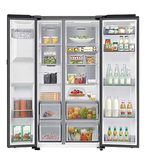 Samsung RS80F Side-by-Side mit autom. Türöffnung und Festwasseranschluss, EEK: E. Geräteplatzierung: Freistehend, Produktdesign: Amerikanische Tür, Produktfarbe: Schwarz. Nutzinhalt Gesamteinheit: 640 l, Klimaklasse: ST, Lärmemissionsklasse: C. Nutzinhalt Kühlschrank: 420 l, Lampentyp: LED. Nutzinhalt Gefrierfach: 220 l, Gefrierfachposition: Seitlich platziert, Gefrierkapazität: 13 kg/24h. Bedienung durch Apps unterstützt: SmartThings