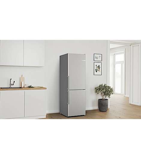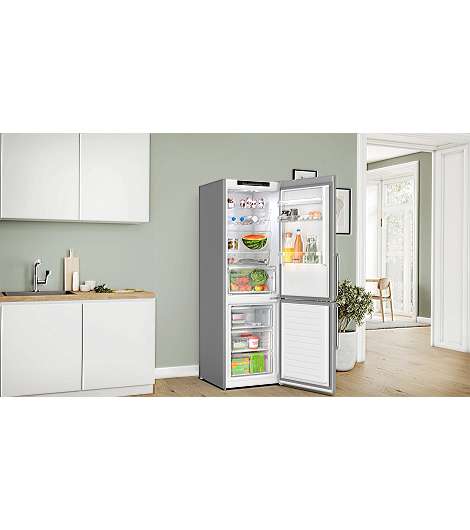 Bosch Serie 4 KGN36VICT. Nutzinhalt Gesamteinheit: 321 l. Türscharnier: Rechts. Klimaklasse: SN-T, Geräuschpegel: 35 dB. Nutzinhalt Kühlschrank: 218 l, NoFrost-Funktion (Kühleinheit), Multi Airflow System (Kühlschrank), Innenbeleuchtung Kühleinheit. Nutzinhalt Gefrierfach: 103 l, Gefrierkapazität: 9,5 kg/24h, NoFrost-Funktion (Gefriereinheit). Fresh Zone Fach. Energieeffizienzklasse: C, Jährlicher Energieverbrauch: 159 kWh. Produktfarbe: Edelstahl