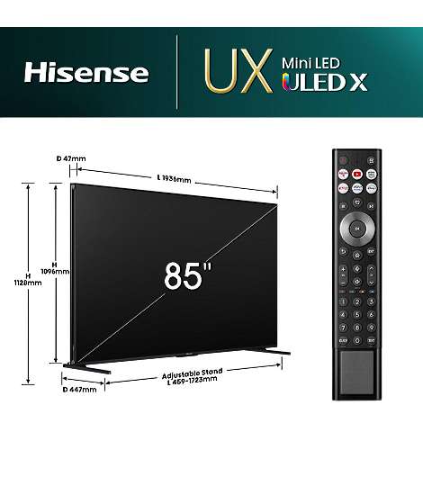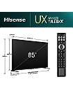 Hisense Mini LED Smart TV 85UXNQ ČR. Bildschirmdiagonale: 2,16 m (85"), Display-Auflösung: 3840 x 2160 Pixel, HD-Typ: 4K Ultra HD, Bildschirmtechnologie: LED, Bildschirmform: Flach, LED-Hintergrundbeleuchtungstyp: Mini-LED. Smart-TV. Helligkeit: 700 cd/m², Reaktionszeit: 6 ms, Kontrastverhältnis: 2000:1, Natives Seitenverhältnis: 16:9. Digitales Signalformatsystem: DVB-C, DVB-S, DVB-S2, DVB-T, DVB-T2. WLAN, Ethernet/LAN. Produktfarbe: Schwarz, Grau