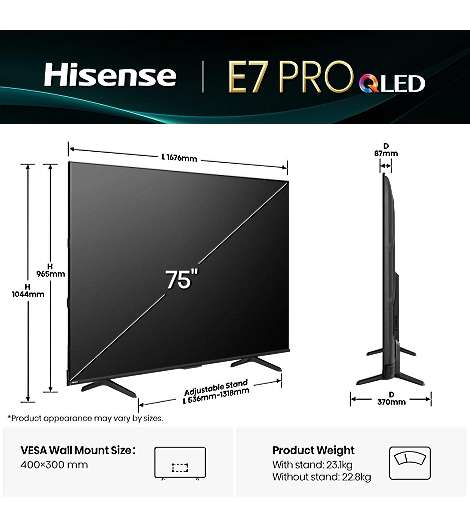Hisense QLED Smart TV 75E77Q PRO ČR. Bildschirmdiagonale: 190,5 cm (75"), Display-Auflösung: 3840 x 2160 Pixel, HD-Typ: 4K Ultra HD, Bildschirmtechnologie: QLED, Bildschirmform: Flach. Smart-TV. Reaktionszeit: 8 ms, Kontrastverhältnis: 2000:1, Natives Seitenverhältnis: 16:9. Digitales Signalformatsystem: DVB-C, DVB-S, DVB-S2, DVB-T, DVB-T2. WLAN, Ethernet/LAN. Produktfarbe: Schwarz